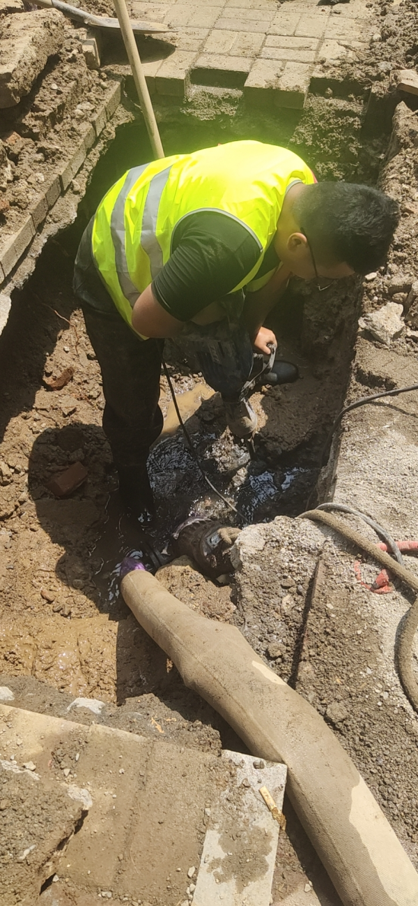 8月7日一早,孟隊(duì)帶領(lǐng)搶修隊(duì)員、檢漏隊(duì)員進(jìn)入福寧小區(qū)。第一步確定有無明漏,先檢查用戶水表,排查結(jié)束未發(fā)現(xiàn)漏水。第二步打開小區(qū)所有井蓋逐一排查,發(fā)現(xiàn)有流水的窨井,搶修隊(duì)員下到井室取水樣,分析、檢測、區(qū)別、排查,一個(gè)不是再到下一個(gè)井室,從早上排查到晚上,排查二十幾個(gè)后,終于在福寧小區(qū)8號樓前井室測試是自來水,至此確定附近有暗漏,這時(shí)指針已經(jīng)是22:47分。第三步檢漏隊(duì)員使用專用“武器”。8月8日00:10分,精準(zhǔn)定位暗漏點(diǎn)位置,確定該管線是de110PE管漏水。為了不打擾居民夜間休息,定于8月8日8:30分施工。施工隊(duì)按照搶修方案快速有序、高效完成搶修任務(wù),于15:02分一次送水成功,福寧小區(qū)壓力恢復(fù)正常。